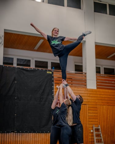 Bei uns steht Zusammenhalt an erster Stelle: Wir motivieren uns gegenseitig, probieren neue Stunts und haben Spaß am Training.  Werde Teil unserer Cheer-Community und lass uns gemeinsam Erfolge feiern!
